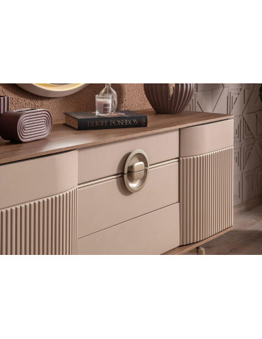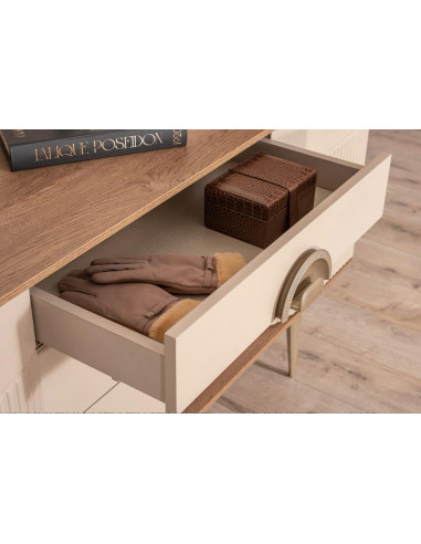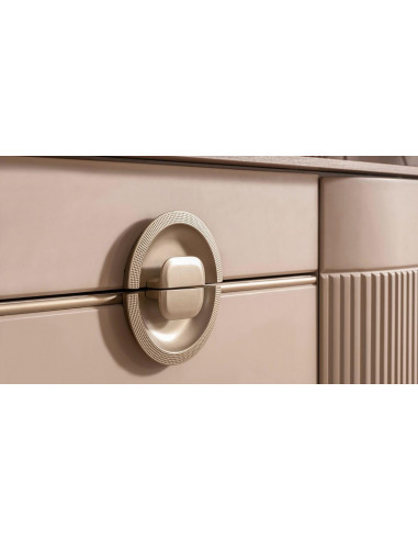 Poignées : Les poignées sont particulièrement remarquables, conçues sous forme de cercles décoratifs en métal doré mat avec une texture délicatement gravée. Ces détails offrent une prise en main agréable tout en ajoutant une touche d'originalité et de luxe à la coiffeuse.