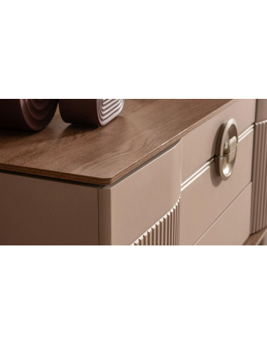 Portes : Sur chaque côté, la coiffeuse présente des portes avec des panneaux latéraux rainurés, ajoutant une texture visuelle intéressante. Les portes offrent un espace de rangement supplémentaire et sont parfaitement intégrées au design global pour une apparence harmonieuse.