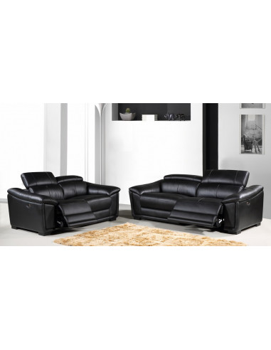 Canapé et fauteuil relax Alexander en cuir Coloris : noir Disponible en canapé 3 places, 2 places Mécanisme relax électrique.. 2 assises relax par canapé Cuir de vachette fleur corrigée et tannée au sel de chrome d'épaisseur 2 mm. Assise garnie de mousse polyuréthane haute résilience de densité 30 kg/m3. Utilisée en literie, la mousse haute résilience est plus confortable et plus robuste que les mousses classiques et vous assure donc un plus grand confort et une meilleure résistance au cours du temps. Suspensionde l'assise sur ressorts et ressorts Nosag et du dossier sur sangles élastiques. Structure pin massif et contreplaqué. Tour de caisse en simili.