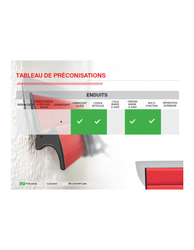Mastic prêt à l’emploi à appliquer au pistolet airless, destiné à recouvrir et uniformiser les plaques de placoplâtre. Produit utilisable sur plâtre, plaques de placoplâtre, supports absorbants habituels de maçonnerie préalablement révisés et préparés (murs et plafonds).